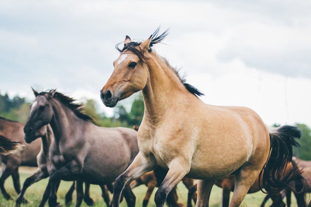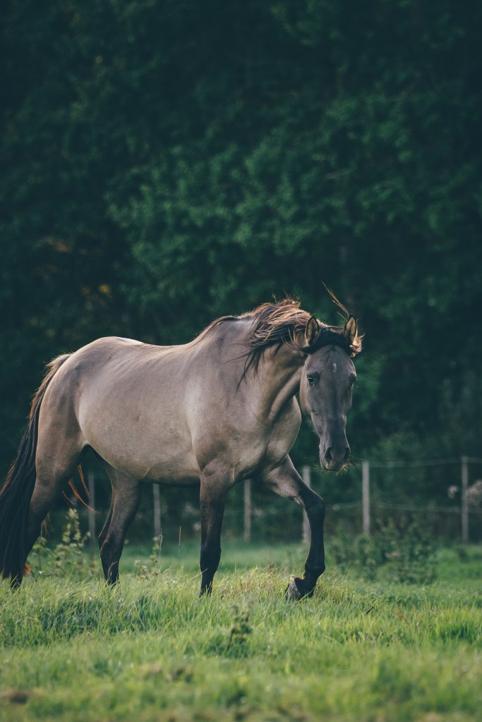 The Kiger Mustang can come in many different colors including dun, grulla, red dun, bay and black.The kiger Mustang should have dun factor and others characteristics expressed. Dun marking factors: Dorsal, leg barring, lacing,cobwebbing on face, mask on face, fishbone/sawtooth on dorsal, eye bars, hock barring, ventral dorsal, fawn in ears, black outline on eras, barring on back of ears,bi-coloring in mane/tail.The Kiger Mustang is generally a medium size horse ranging from 13.2 hands to 16 hands, with a preferred height of 14-15.2 hands.